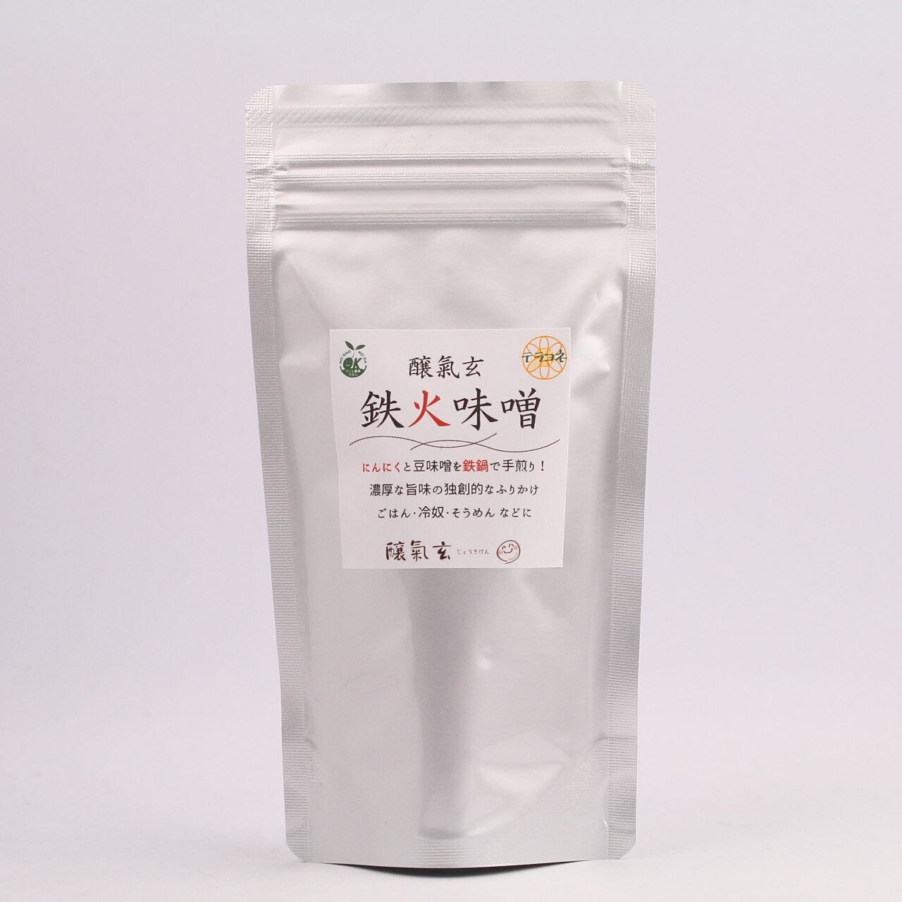 それらを心を込めて細かく刻み、豆味噌と太白胡麻油をあわせて、2日間ほど鉄鍋でていねいに炒り続けたのが、この鉄火味噌。契約農家さんが自然栽培(無農薬・無肥料)した「朝日米」の米糠を加えてありますので、いっそう旨味が増しています。
